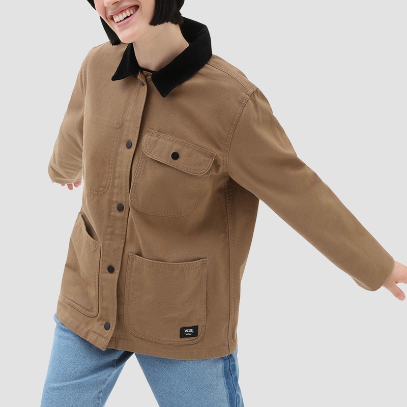 The Drill Chore Jacket is a 100% cotton canvas chore coat with a corduroy collar, patch pockets, a snap-front placket, and a woven logo patch.