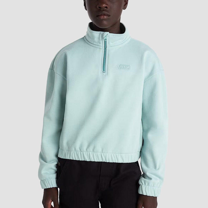 The Vans Girls Half Zip Mock Sweatshirt features a half zip, long sleeves and the Vans logo on the left chest.