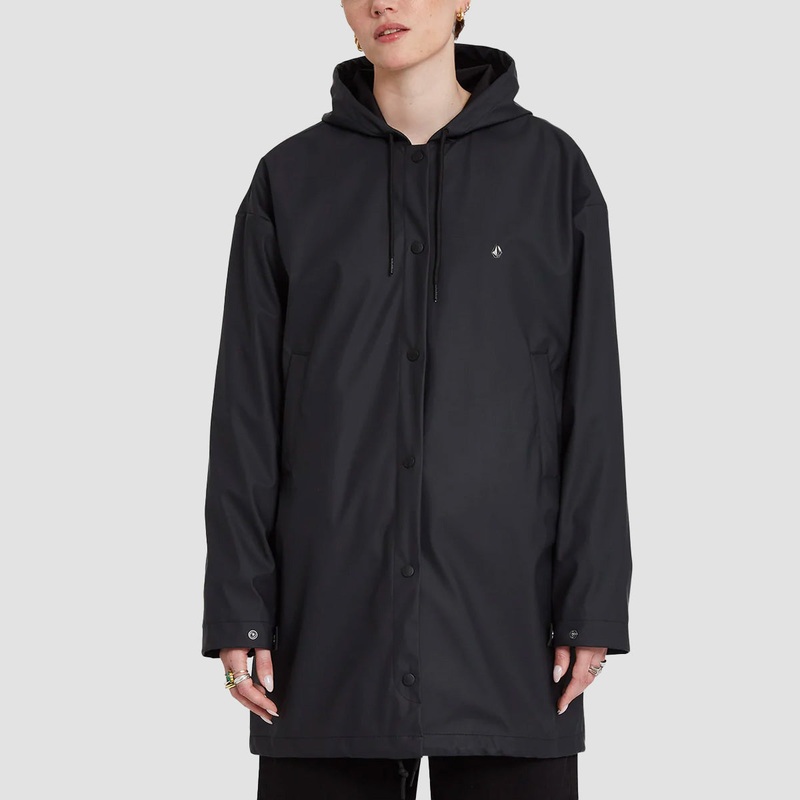 Women's long straight raincoat jacket Loose fit Volcom snap button at front closure Water resistant : 5000mm 2000 mm PU coating Hood with adjustable drawcord Adjustable bottom with drawcord Light weight fabric gusset at inner cuff Featured Artist collectio