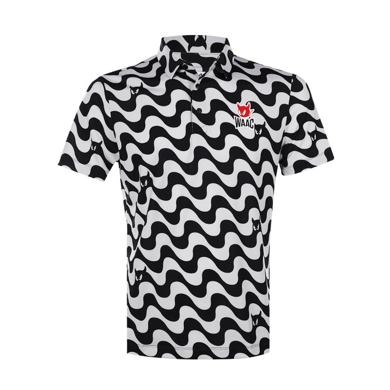 A short-sleeve t-shirt featuring a two-tone wave pattern for a distinctive look. It has a 3-button placket with a classic collar for a neat appearance.Material: 91% Polyester, 9% Polyurethane Made from highly stretchy material.