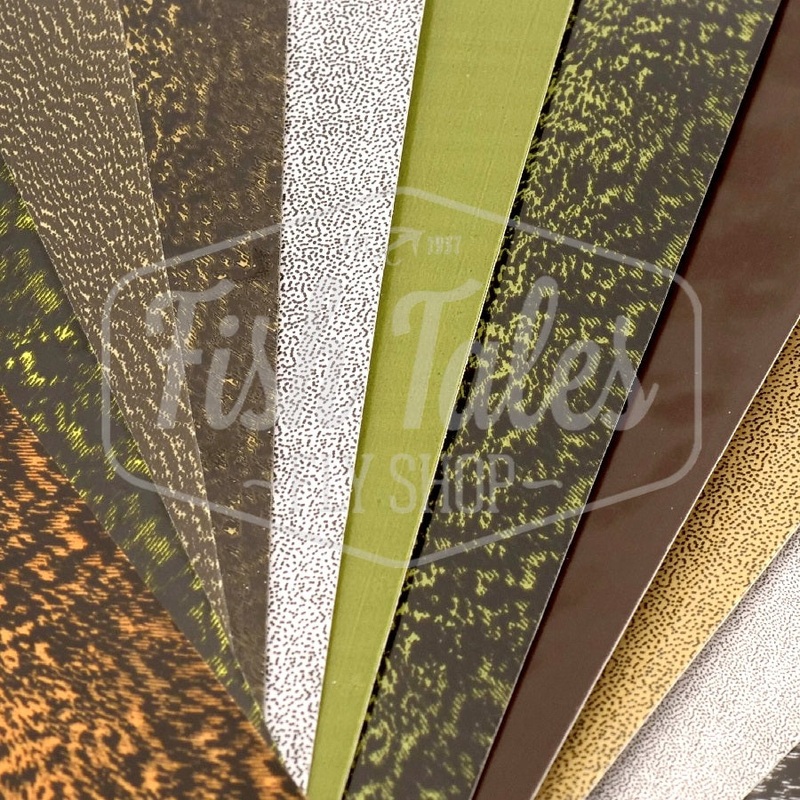 Wapsi Thin Skin is a .004 thick, stretchable and transparent sheet material that has a matte finish on one side and a shiny finish on the other. It is backed with a paper backing which makes it easy to cut into strips of all sizes. When the paper is removed, the transparent sheet can easily be tied onto the fly. The printed patterns on Thin Skin can create an extremely realistic and/or dramatic look to the fly. Because Thin Skin stretches and compresses when thread or wire is wrapped around it, it is an ideal material to use for shellbacks on flies such as scuds or sowbugs or for wing cases on nymphs of all types. Many bass and saltwater fly tyers often use it to tie segmented crayfish and shrimp patterns.
