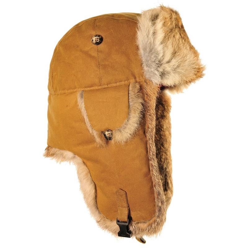 Ear flaps can be buttoned up for easier hearing. Chin strap can close snug around face or clip on top of crown as a cap.