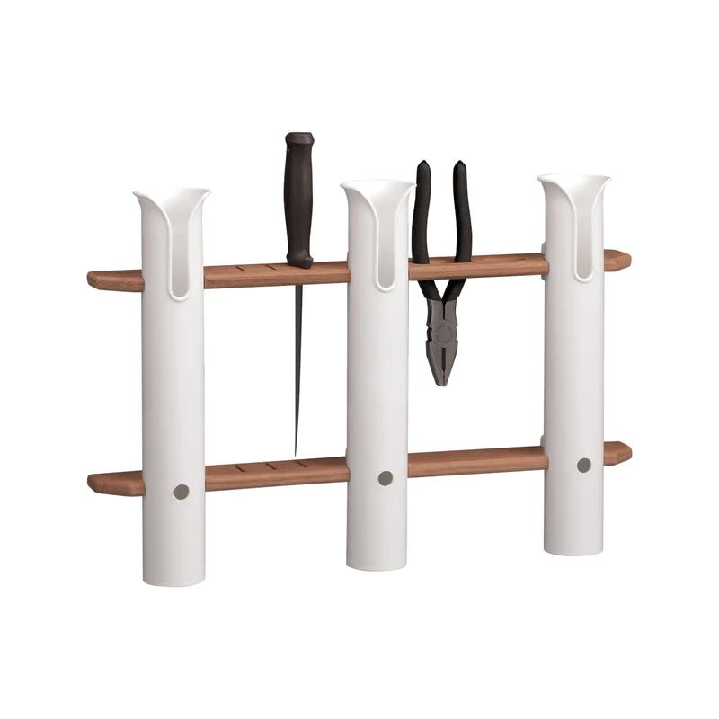 WHITECAP TEAK PRODUCTSTEAK THREE-ROD TOURNAMENT STORAGE RACKPart Description63449 17-5/16 W x 12 H x 2-5/8 D Includes all mounting hardware White polypropylene tubes Includes 2 knife & plier holder slots