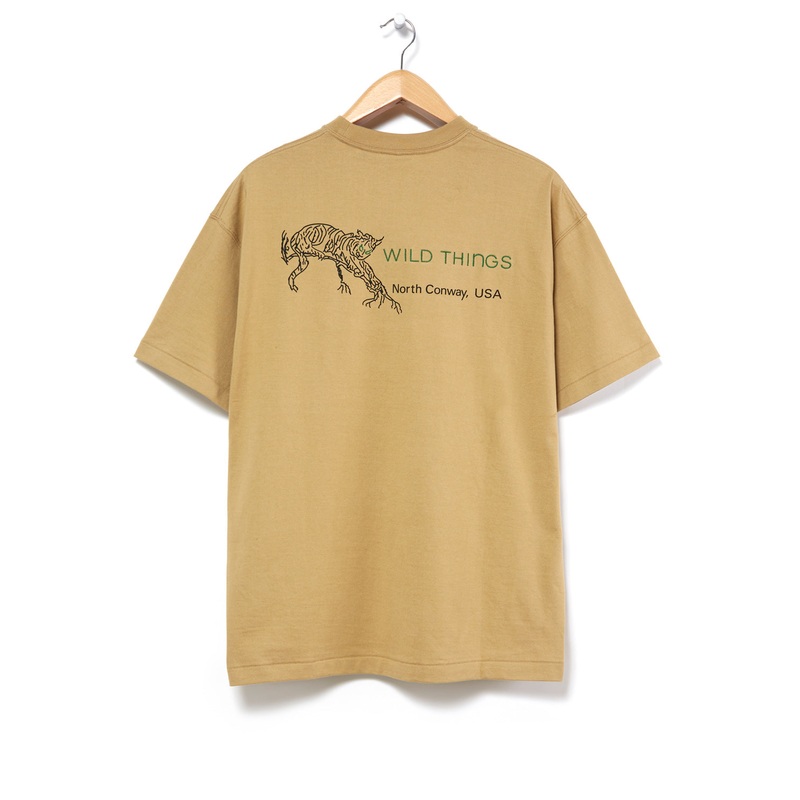 Wild Things create this oversized t-shirt, replete with Wild things embroidery to the chest and a print embroidery mix print to the back with a wild cat lounging on a branch. The graphic also calls out Wild Things spiritual home of North Conway, USA.