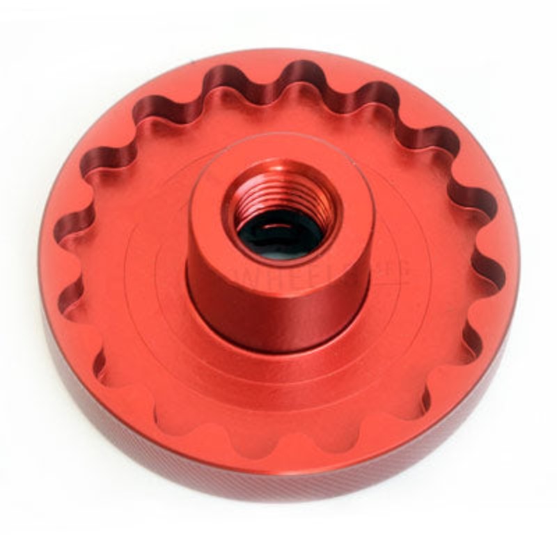 Single-sided socket-For 48.5mm, 16-notch bottom bracket cups-Machined 3/8'' drive for use with torque wrenches-Durable, red anodized finish-48.5mm/16-notch B.B.-Thin Flange Bottom Bracket Socket Designed to create a tight grip on thin flange bottom bracket