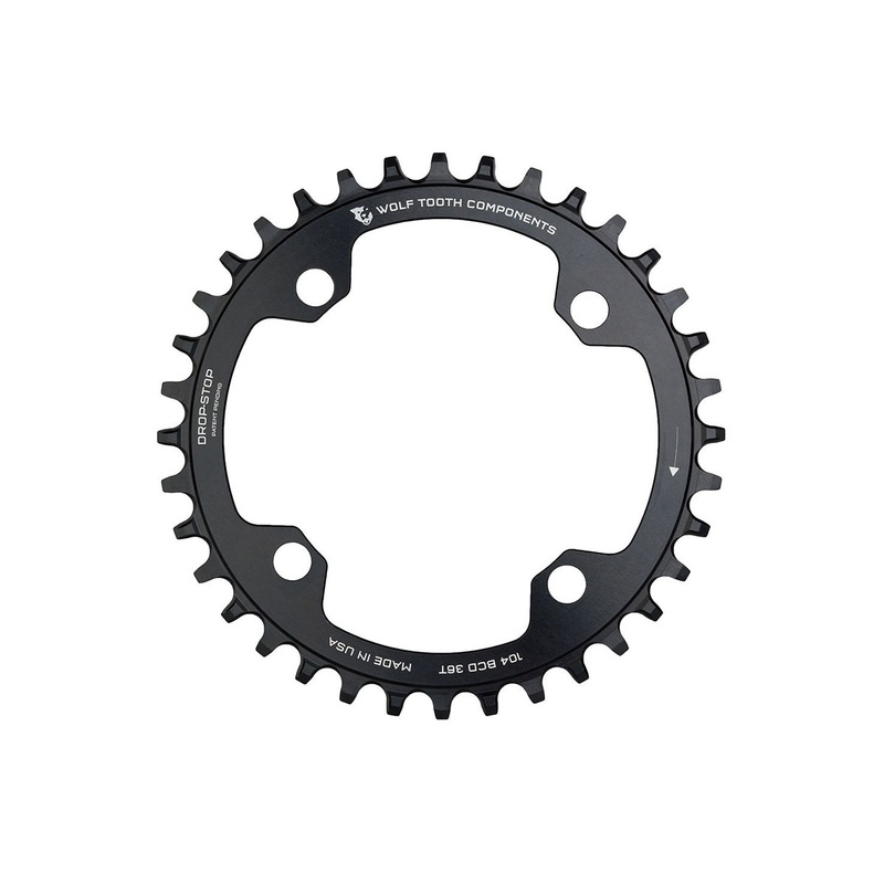 - Drop-Stop technology. On Wolf Tooths patented wide/narrow chainring, the wide side of the tooth has maximum contact on the drive side which spreads the load and improves chainring life. The narrow side allows clearance for mud and debris which reduces friction.