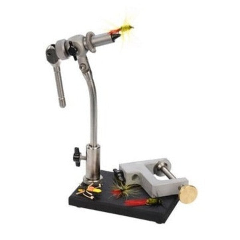 The Wolff Indiana Apex Fly Tying Vise is an in-line rotary fly tying vise equipped with replaceable jaws, c-clamp, pedestal base, and material clip. The Apex Vise is crafted from 440-C and 303 stainless steels with 0-1 tool steel jaws that hold a wide rang
