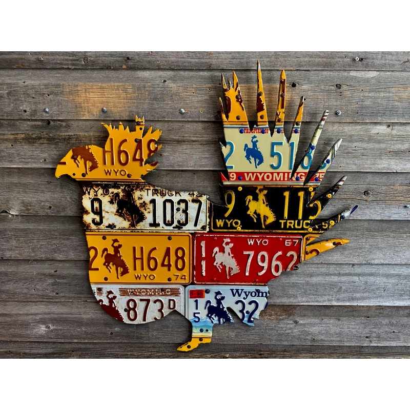 With Frame Add-on– While my pieces look amazing hung without a frame, I feel that mounting the artwork on Barnwood really adds definition and depth, and perfectly compliments aged license plates. Should you choose to have your piece framed, please specify whether you would like Espresso-stained or natural barnwood as the background in the Special Notes and Requests textbox prior to adding it to your cart.