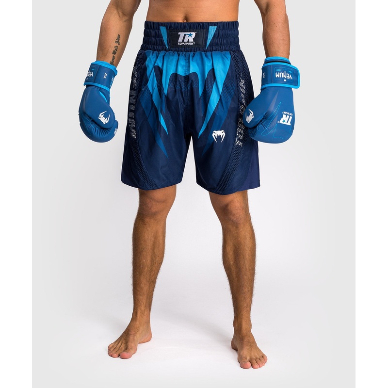 A truly collaborative co-branded design, the Top Rank logo features on the traditional style patch at the front of the waistband, while the logo sits at the back of the waistband. The main body of these navy blue shorts feature the snakehead fangs in a lighter blue.