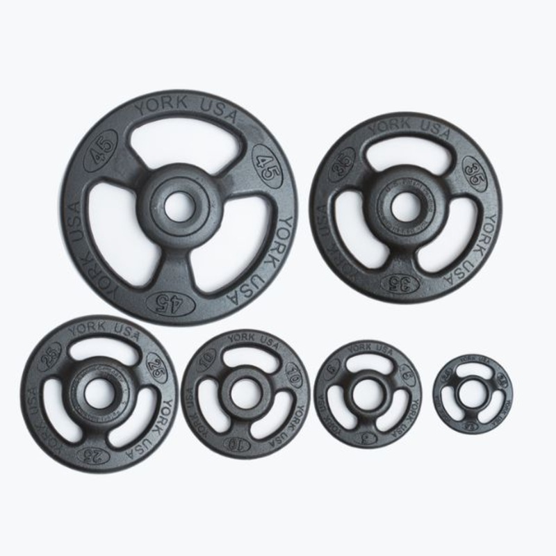 York Barbell Iso-Grip Steel Composite Olympic Grip Plate Sets**For custom plate sets, you can call us at 888-995-4450**Tired of struggling with awkward weight plates during your workouts?Say goodbye to pinched fingers and clumsy handling with the revolutio
