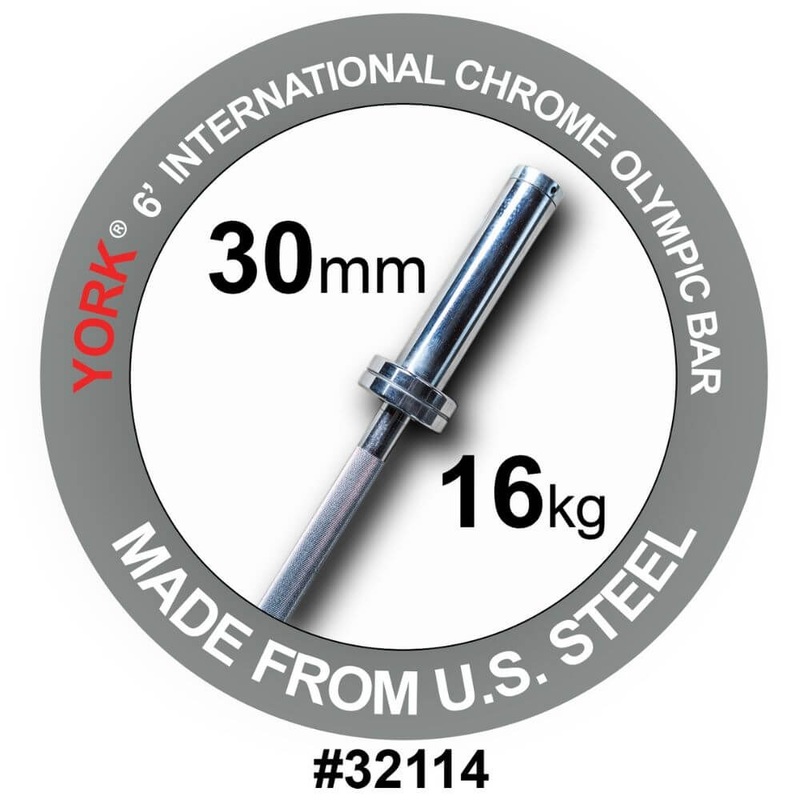 6' International Chrome Olympic Bar by York BarbellYORK applied its vast knowledge in bar design and produced perhaps the highest quality, most functional and attractive Economy Olympic Bar of today.FEATURESThe YORK signature design replaces the outmoded b