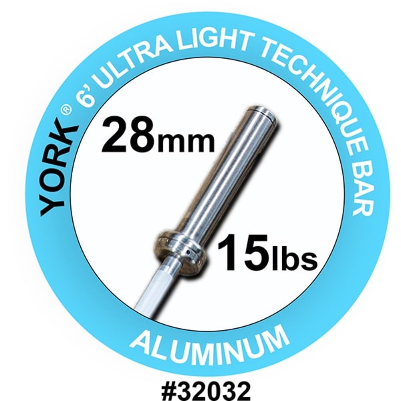 York 6' Ultra-Lite Aluminum Bar-15 lbsThe Ultra-Lite Aluminum Weight lifting bar is 28 mm diameter, 6bar and weighs 15lbs but is significantly reduced in weight so that the trainee can focus 100% on form and not the weight of the bar. The York Barbell Ultr