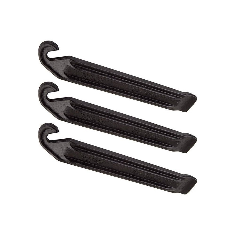 These nylon tire levers make removing a tire easy on your fingertips and nails. Set of three nests together to conserve space in a pack or bag.