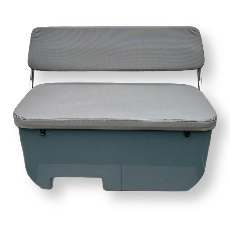 This beautiful fiberglass bench seat is a factory OEM part we were able to get directly from Zodiac. It features a fold down back rest, a luxurious flip up seat cushion that gives way to a generous storage area, very comfortable cushions. Measurements are